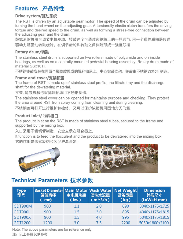 鼓式濃縮機用可調節電機驅動,轉鼓速度可通過齒輪箱上的手動齒輪調節,用一個彈性聯軸器傳送驅動力矩驅動轉鼓旋轉,在調節齒輪和轉鼓之間伴隨形成一強度聯接。