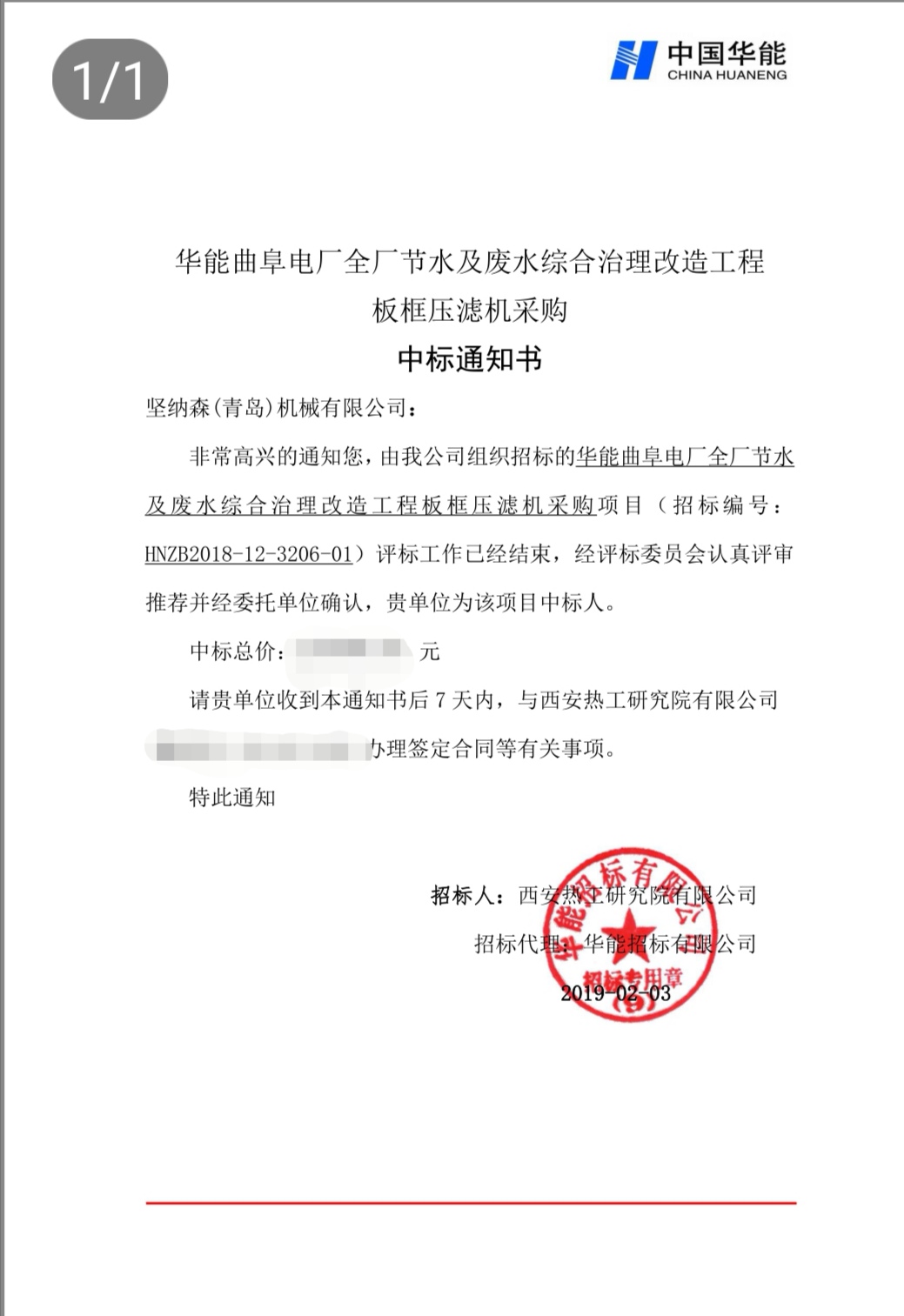 2019年2月3日(臘月二十九),春節前的最后一個工作日,堅納森(青島)機械有限公司,收到西安熱工研究院有限公司頒發的:《華能曲阜電廠全廠節水及廢水綜合治理改造工程板框壓濾機采購》中標通知書。